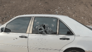 对于步枪射击的威力,民用轿车更是根本挡不住,车门轻易被射穿。