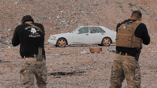 图中老哥利用车门掩护自己掏枪动作,然后对着车门开枪假想杀伤车外抢劫的匪徒。能看到他对着车门最先开了两枪。