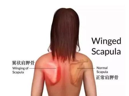 翼状肩胛:正常人的肩胛骨主要前锯肌与斜方肌的协同收缩使其紧贴胸壁,如果前锯肌和斜方肌力量薄弱,就可使肩胛骨失去贴胸的作用力,脊柱缘失去牵拉而翘起,形成似蝴蝶翅膀样的畸形。