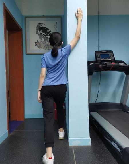 起始:右前臂和右手抵住门框站立。手肘置于肩关节之上,