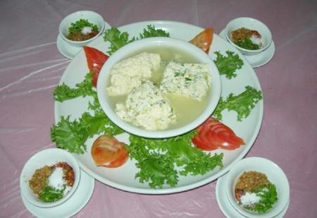 苗家菜豆腐,是湖南省湘西土家族苗族自治州的特色美食。制作时,锅里加适量冷水,将黄豆粉倒入并搅匀,文火煮开即倒入青菜类,稍加搅拌,待菜煮熟后退火,用酸菜汤点浆至汤水变清为止。配以辣椒粉、野葱、大蒜等佐料,即可食用。