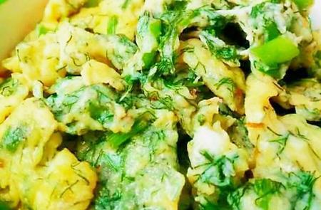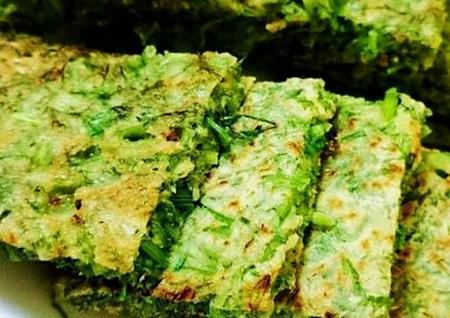 (3)起锅烧油,油热倒入蛋液,煎至蛋液凝固,两面呈现金黄色,可以煎成一块块的,也可以煎成一整个的,圆形的鸡蛋饼,好吃的“茴香苗炒鸡蛋”就做好了。