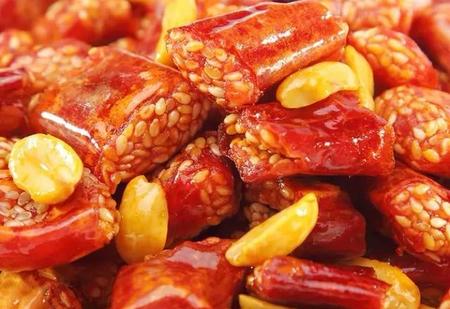 材料:干辣椒、糯米粉、淀粉、芝麻、花生粒、鸡蛋、盐